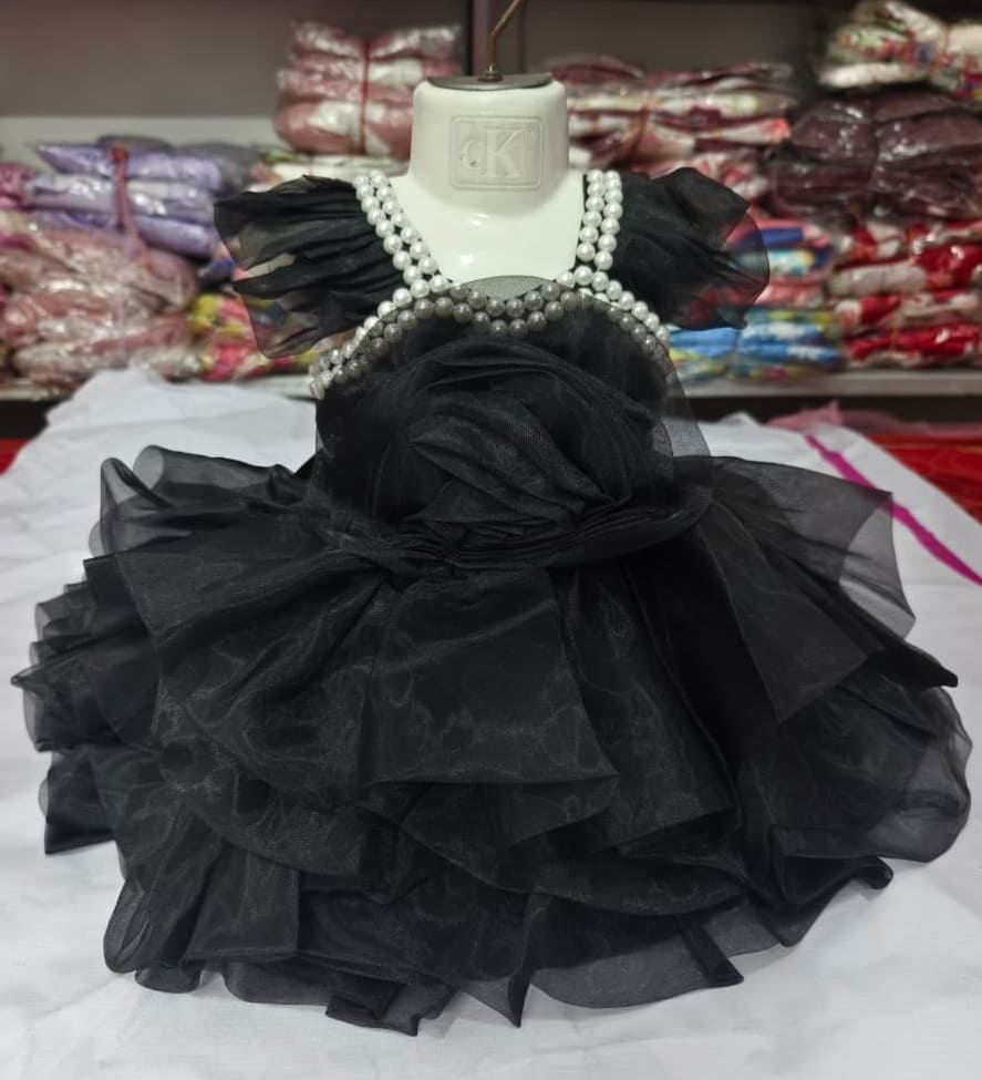Luxury Black Rose Party Gown for Girls with Pearl Neckline & Ruffled Tulle