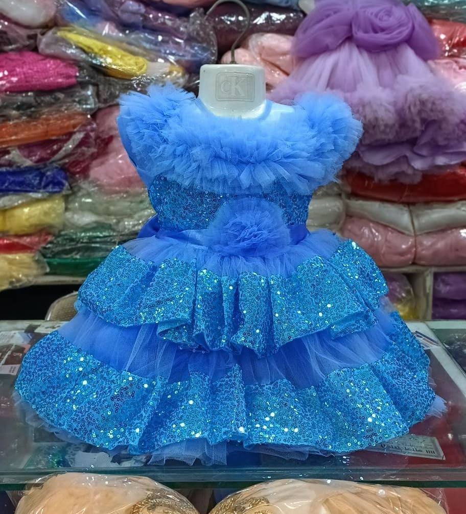 ড্রেসটির প্রধান আকর্ষণ হলো এর নিচের অংশের গ্ল্যামারাস ফ্লেয়ার্ড ডিজাইন। এখানে একাধিক স্তরে বা লেয়ারে ঝকঝকে নীল সিকুইন (Sequin) এমব্রয়ডারি করা বর্ডার ব্যবহার করা হয়েছে। এই সিকুইনগুলো আলোর নিচে চমৎকারভাবে চমকায়, যা নেট ফেব্রিকের সাথে মিশে একটি ভলিউমিনাস বল গাউন শেপ দেয়। প্রতিটি লেয়ার অত্যন্ত যত্ন সহকারে সেট করা হয়েছে যাতে ড্রেসটি সবসময় ফুলে থাকে এবং হাঁটাচলার সময় রাজকীয় আবেশ তৈরি করে। জন্মদিন, বিয়ে বাড়ি কিংবা রাজকীয় কোনো ডিনারের জন্য এই ড্রেসটি হবে আপনার সোনামণির জন্য সবথেকে স্টাইলিশ চয়েস।