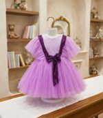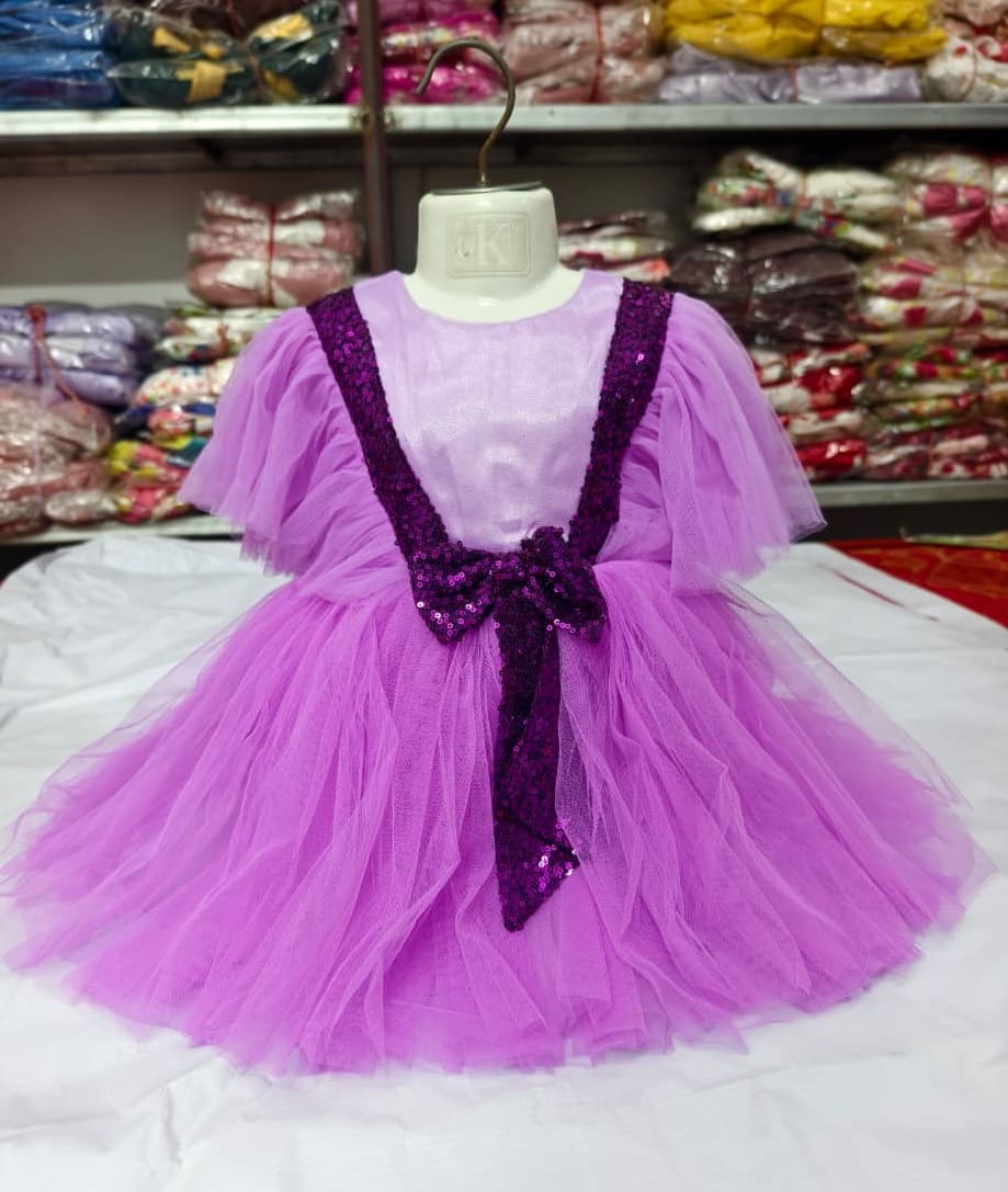 Premium Lavender Net Party Frock for Girls with Sequin V-Strap & Bow Detail