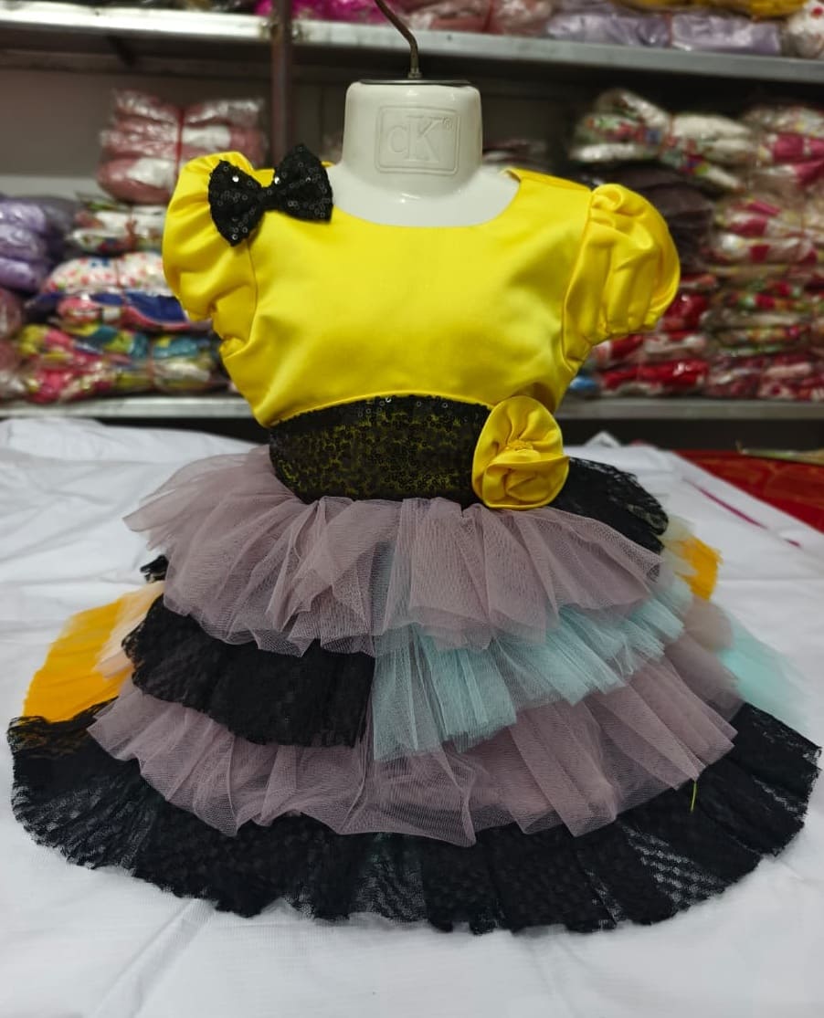 Premium Yellow & Multicolor Tiered Party Gown for Girls with Sequin Bow and Lace Detail