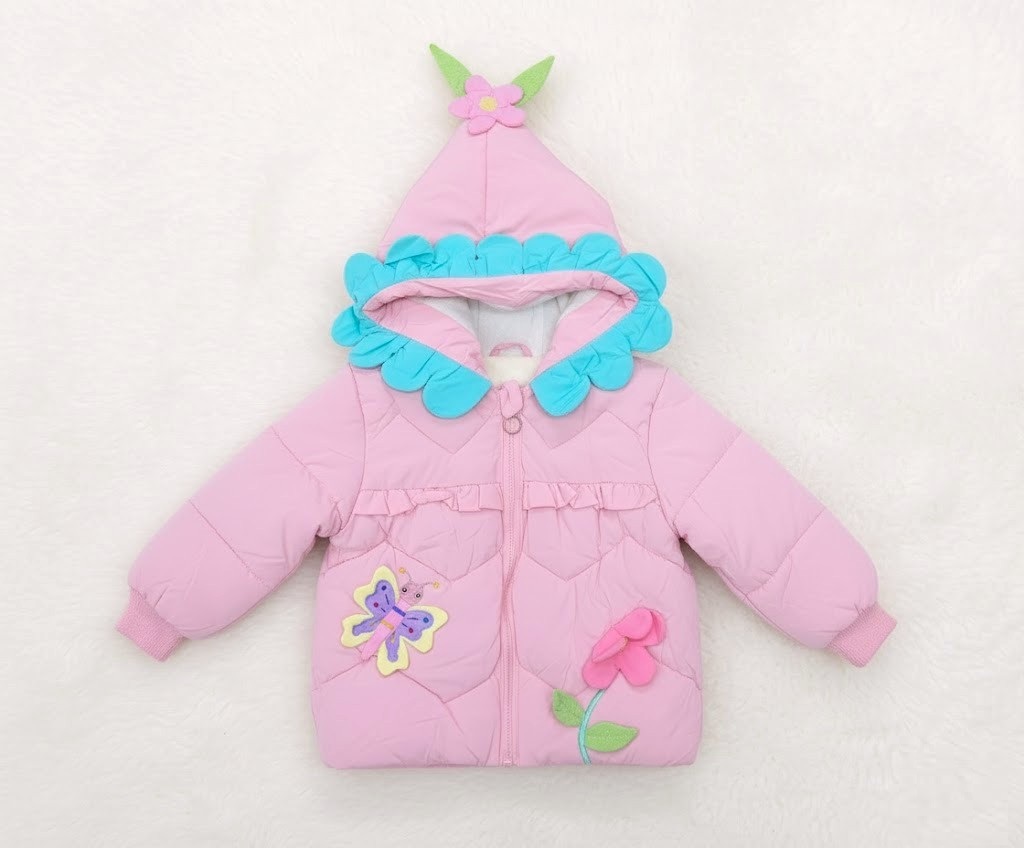🌸🦋 ফুলের রানি: পিঙ্ক হুডযুক্ত পাফার জ্যাকেট (ফুলের অ্যাপ্লিক ও স্ক্যালপ হুড সহ)